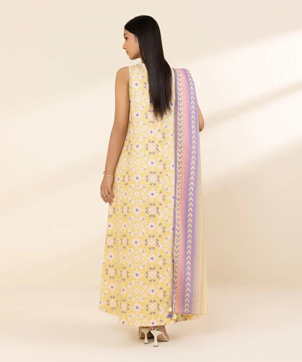 Make a statement with our three-piece printed yellow ensemble featuring a lawn shirt paired with a multicoloured voile dupatta and cotton trousers.