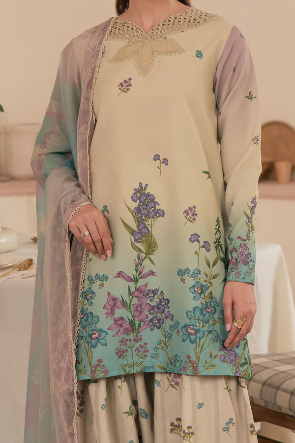 Printed lawn silk embroidered shirt, paired with printed lawn silk farshi shalwar & chiffon dupatta