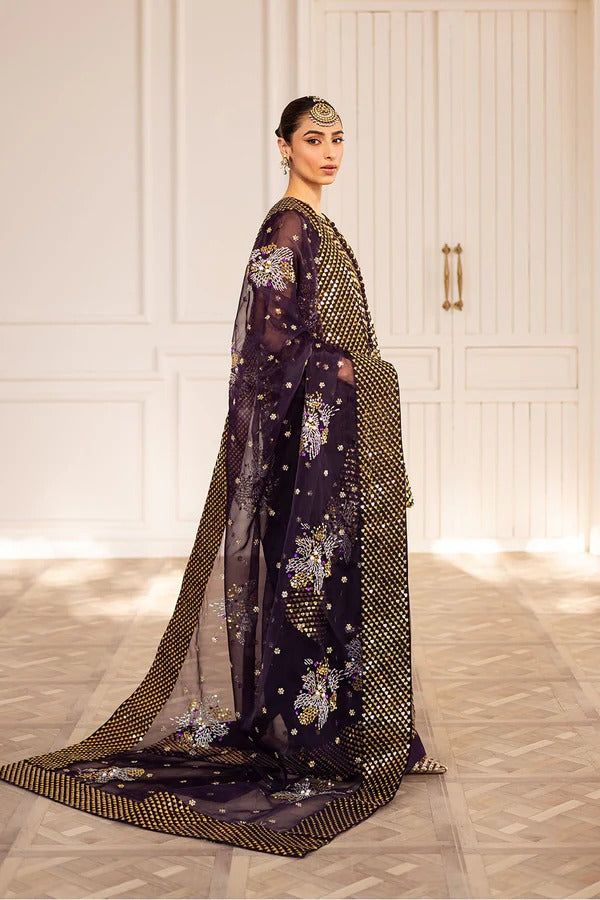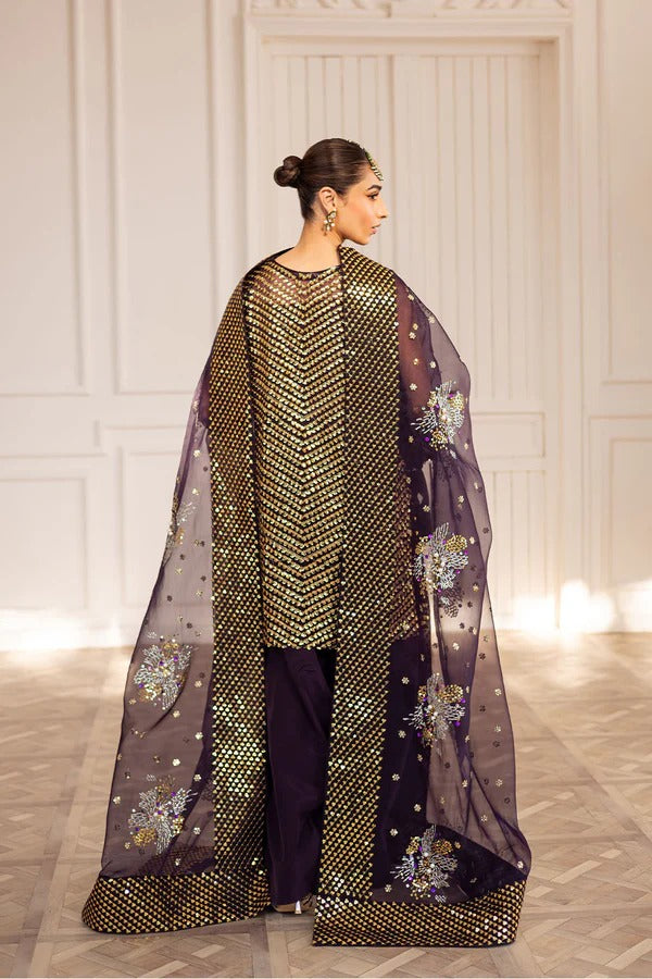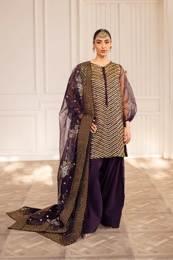 A plum sequin organza short shirt with puffed sleeves, paired with farshi shalwar and embroidered organza dupatta with embellishments