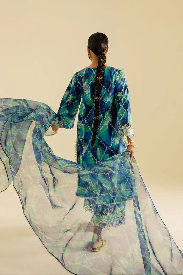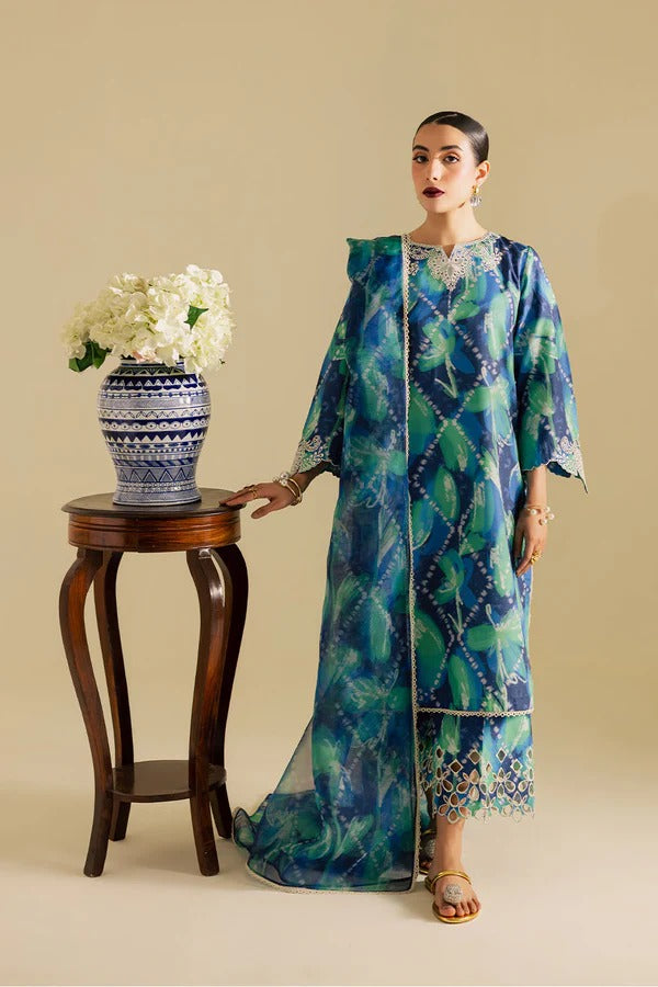 Printed shirt with schiffli embroidered neckline and sleeves, paired with schiffli culottes and organza print dupatta