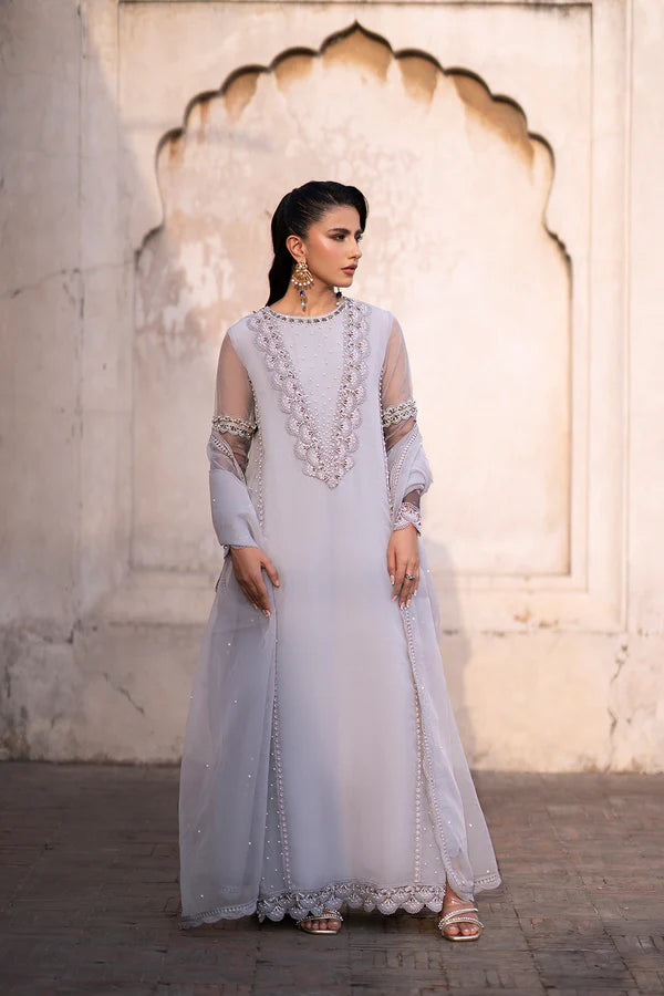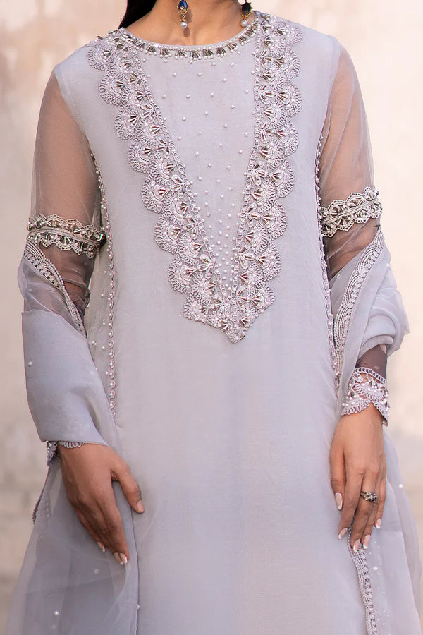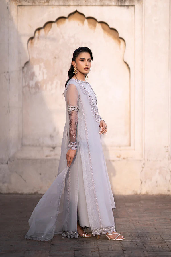 Silver grey, organza long shirt with delicate hand work and lace details highlighted-floral printed sleeve detail, paired with raw-silk culottes