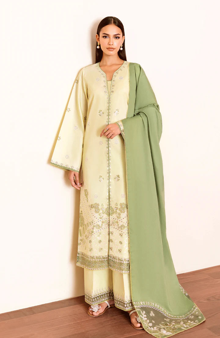 Aera is a soft pastel pistachio three-piece outfit that strikes the perfect balance between elegance and ease. The open-style shirt is beautifully adorned with intricate thread embroidery on the front, and sleeve borders. Paired with an embroidered voile dupatta in a pine leaf shade, the look is elevated with subtle contrast and charm. The outfit is completed with matching trousers featuring delicate embroidery on the hem.