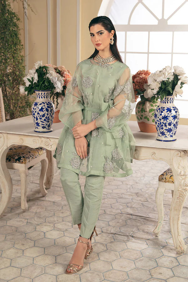- ce Blue Bat Shaped Embellished Wrap Paired With Raw Silk Trouser & Inner