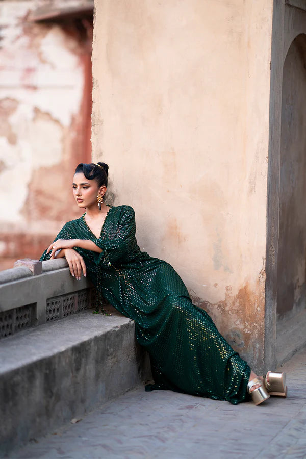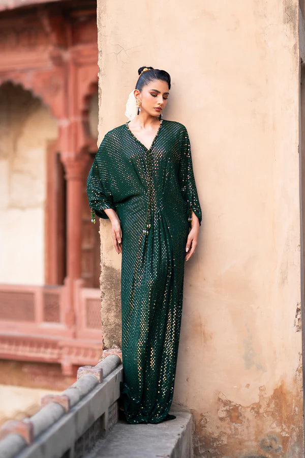 Emerald green sequinned kaftan with hand embellished details around neck and sleeves.