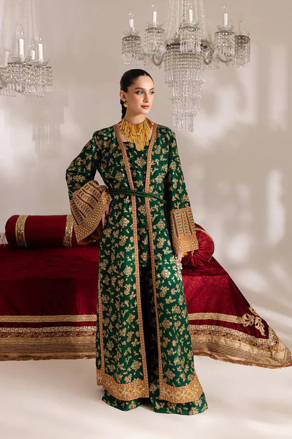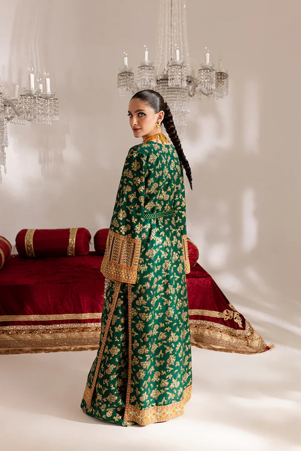 Green raw silk hand printed gown with embroidered cuff & borders, paired with hand printed chiffon separate inner and raw silk hand printed plazo.