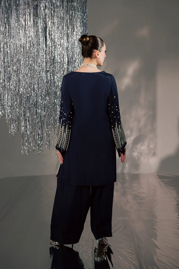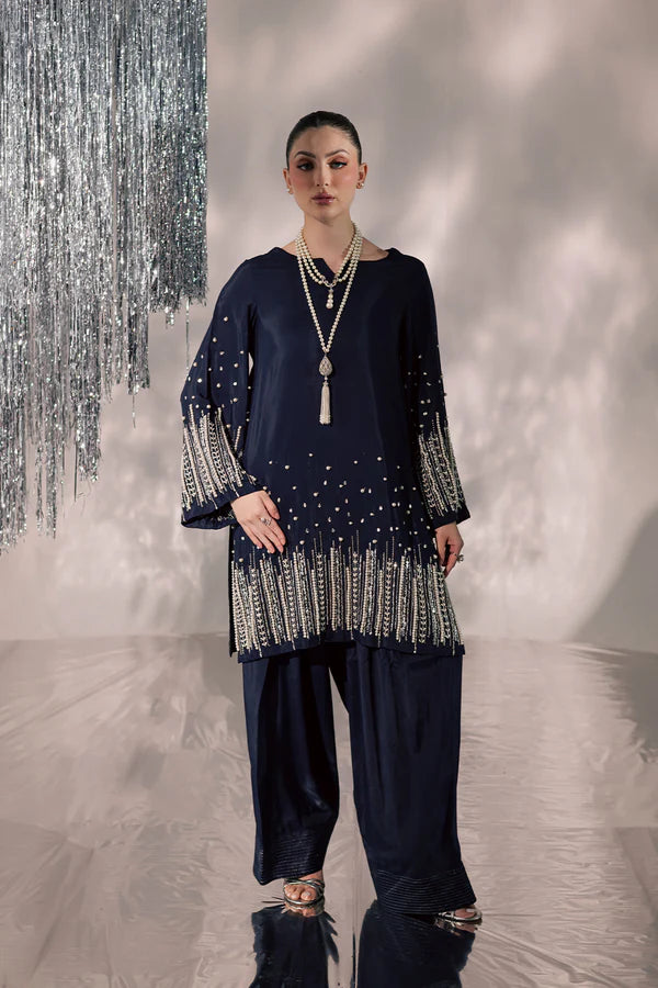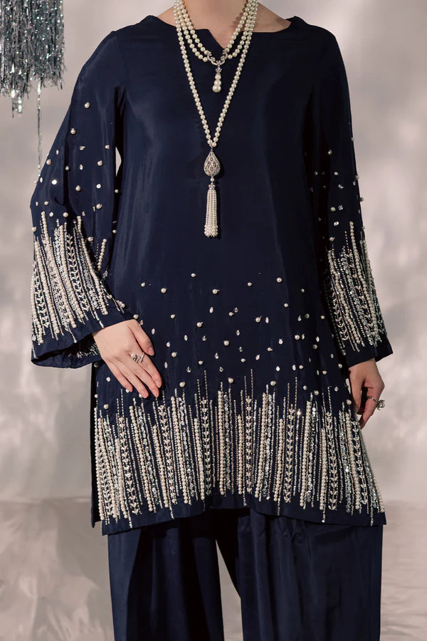 Chic Navy blue ensemble featuring a straight shirt with silver sequin and bead embellishments. Detailed cuffs and hemline add a striking sparkle, paired with farshi shalwar for elegance