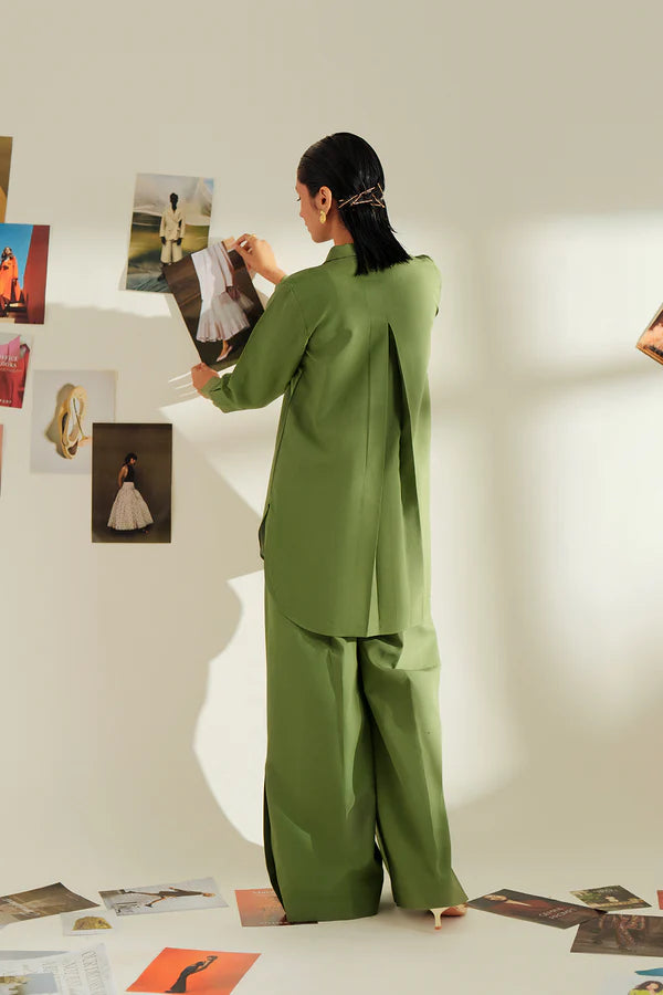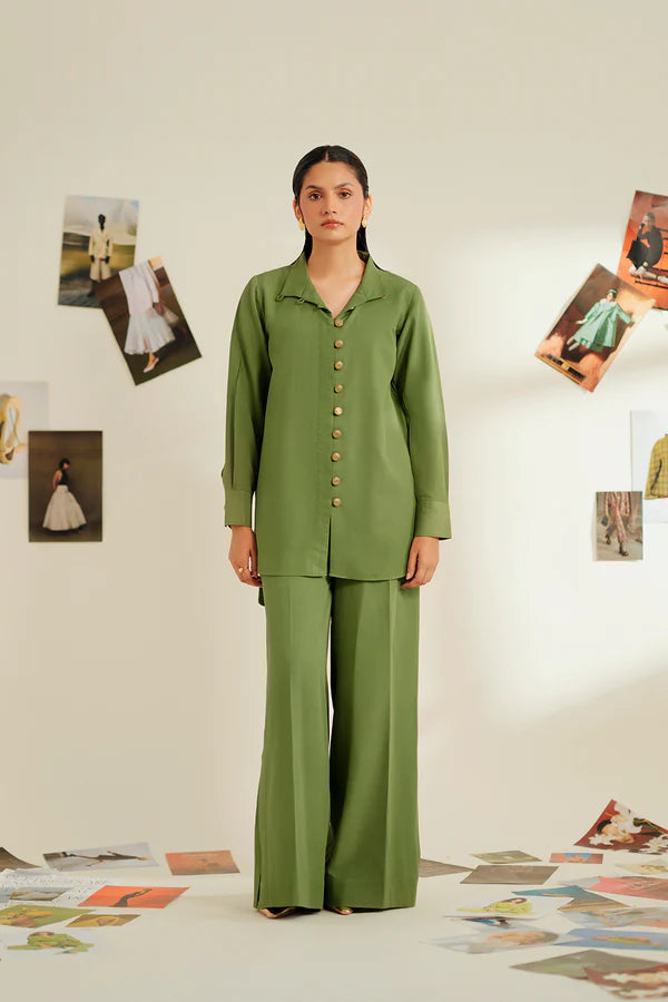 An olive green georgette CO-ORD set featuring a convertible collar and button-down shirt with tailored cuff sleeves, paired with wide-leg slit trousers for a breezy yet sophisticated look