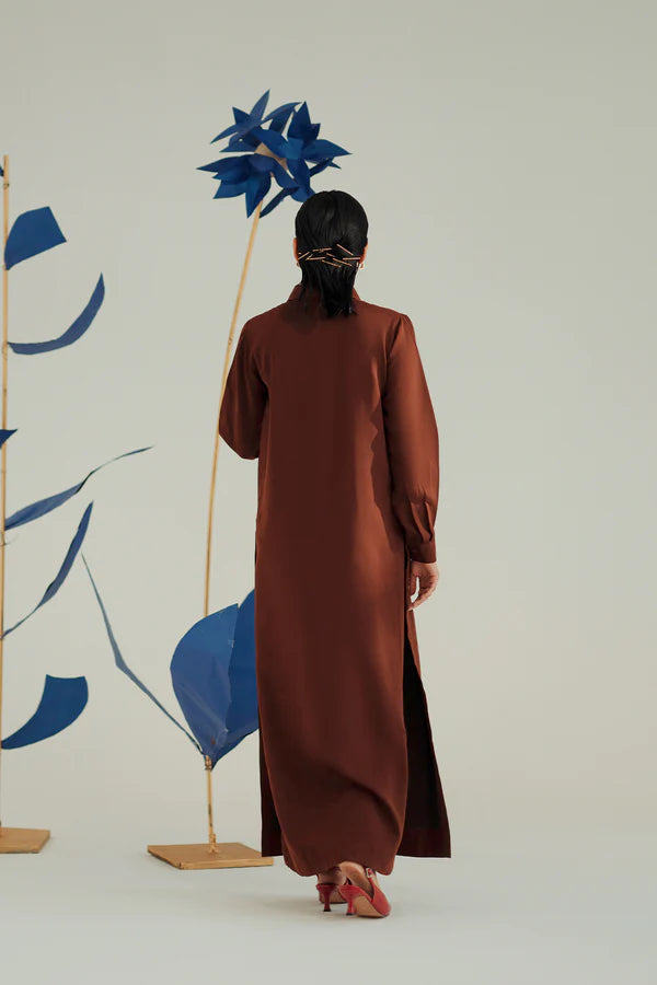A long dark brown georgette button-down shirt featuring a classic collar, cuffed sleeves, and side slits for added movement and style