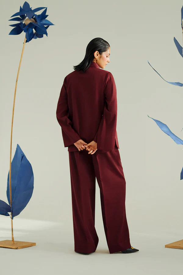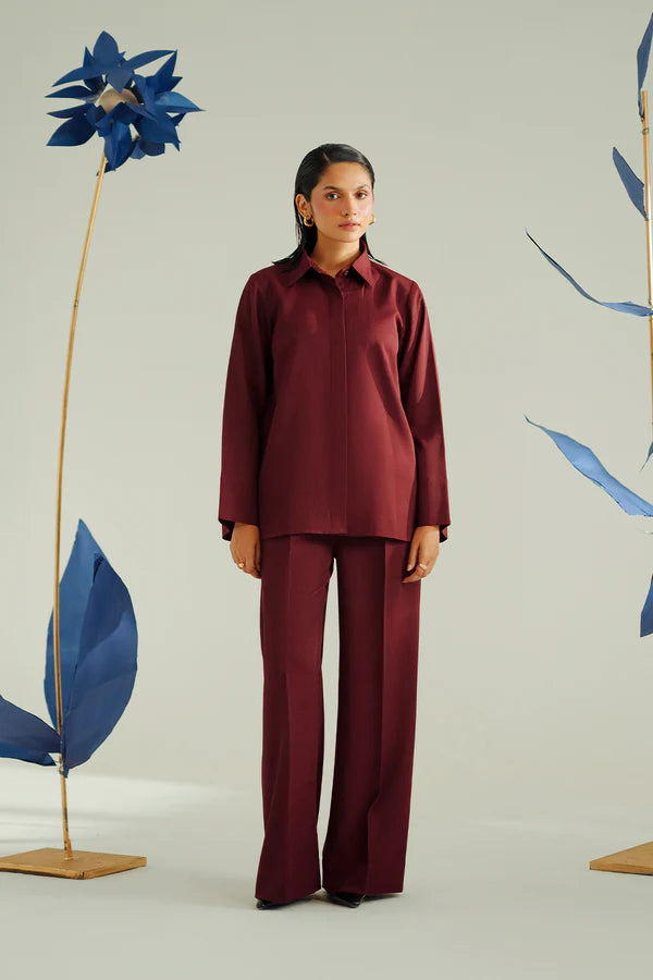 CO-ORD set in a soft georgette, featuring collared button down shirt with tailored wide leg pants