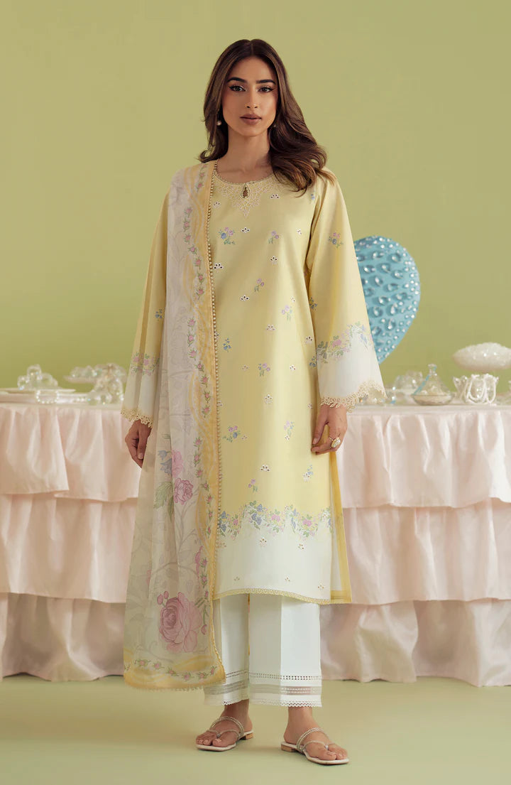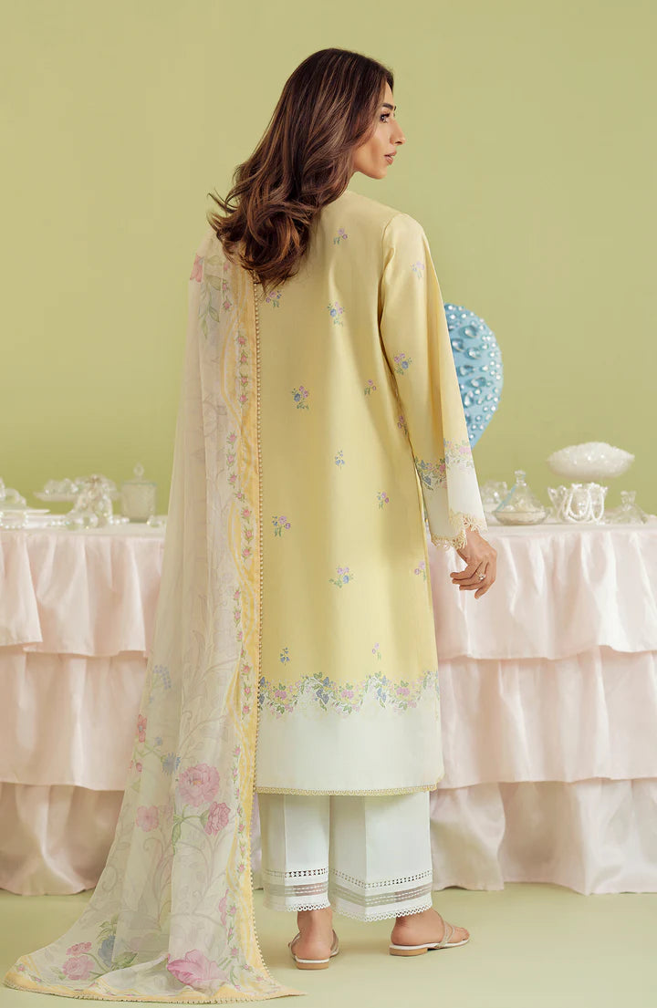 Introducing 'Izzy' – a radiant pastel yellow lawn and silk ensemble featuring delicate floral embroidery on the neckline, sleeves, and hem, paired with a light weight floral print silk dupatta. This breathable yet luxurious set blends intricate craftsmanship with effortless elegance for sunlit sophistication.