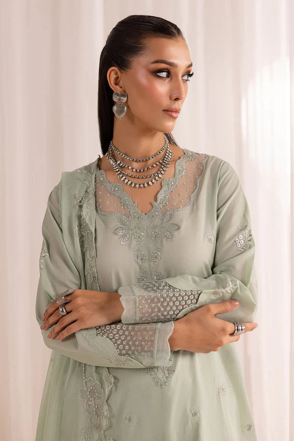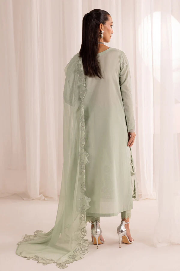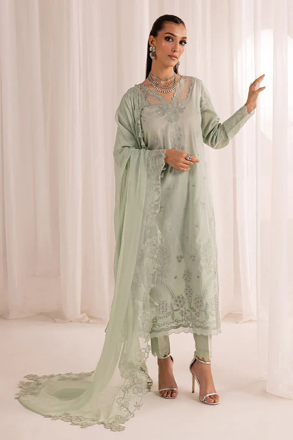 Embroidered And Embellished Lawn Shirt Paired With Embroidered Chiffon Dupatta And Dyed Cotton Trouser