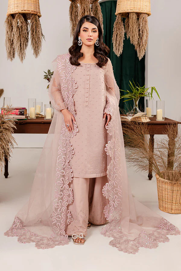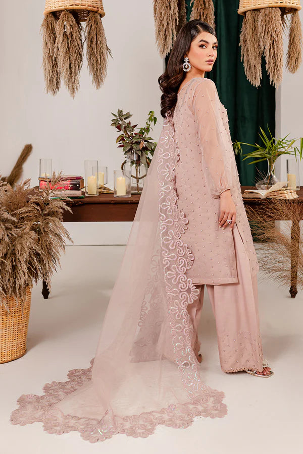 Rose gold short shirt with hand embellishments, matching fabric buttons on placket, sequined embroidery dupatta paired with hand embellished shalwar