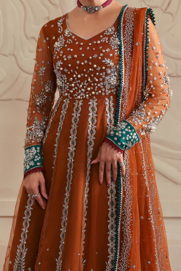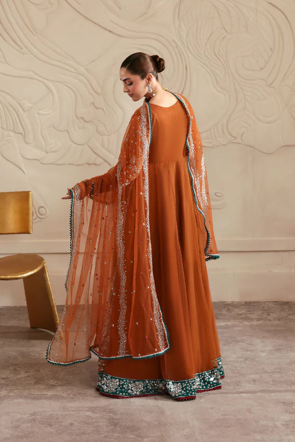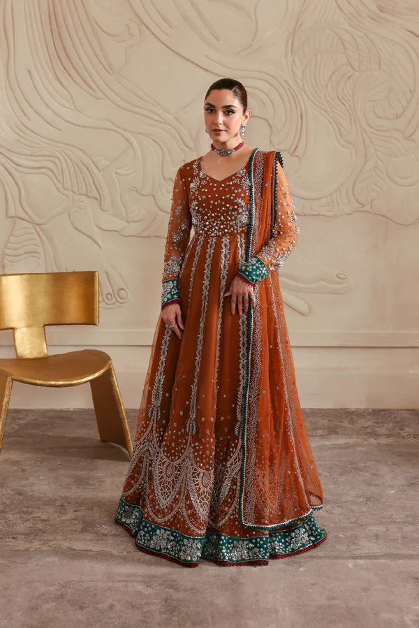 Peshwas is a rust-toned net fabric ensemble beautifully adorned with silver embellishments and intricate thread work. The long, flared silhouette features detailed embroidery along the hem with hints of green and maroon, adding richness to the look. Paired with a matching dupatta, it creates an elegant and regal statement.