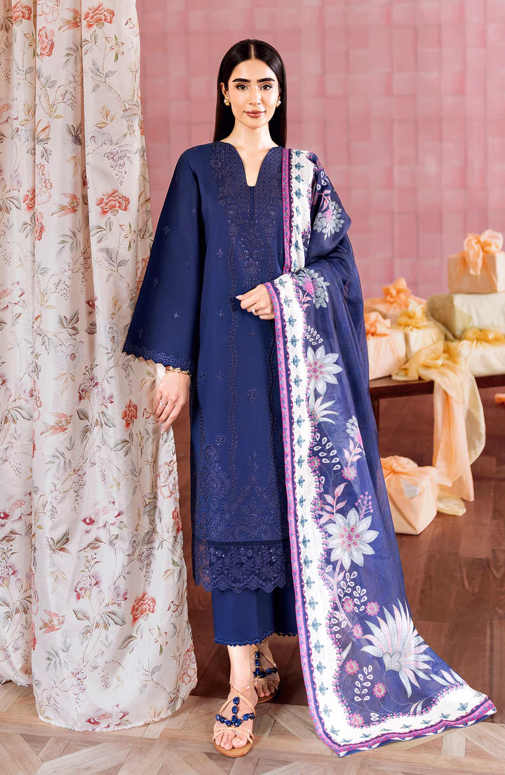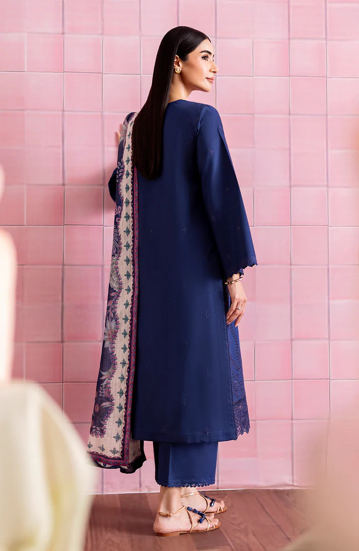 Drenched in a rich navy blue, this ensemble blends exquisite craftsmanship. The fully embroidered lawn shirt showcases intricate detailing on the neck, front, back, and sleeves. every stitch telling a story of artistry. Paired with a sleek plain trouser and a statement printed monar dupatta, perfect for those who dress with grace, intention, and a hint of bold charm.