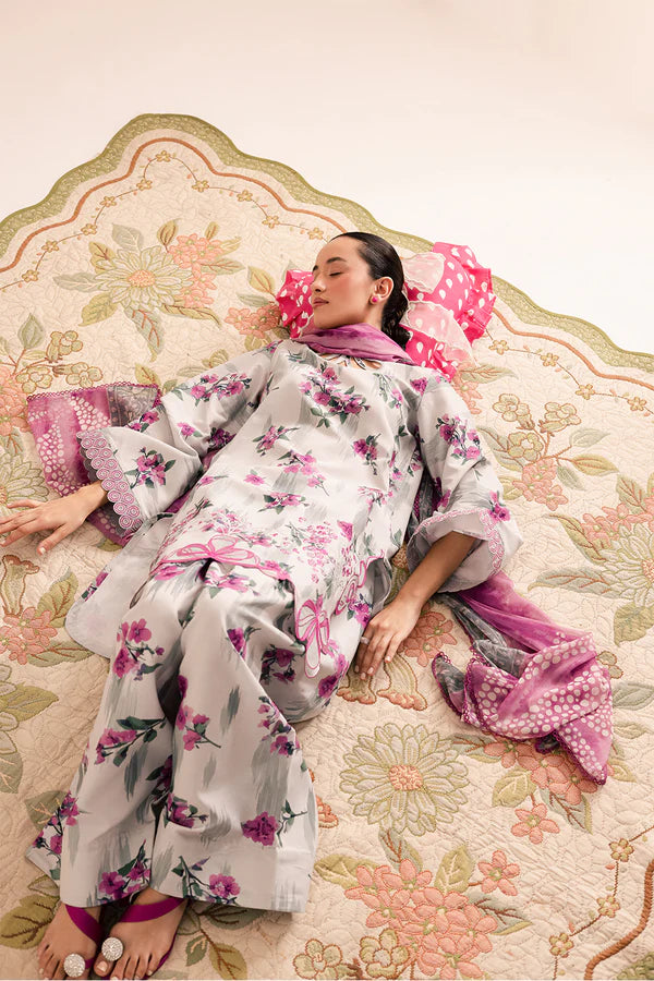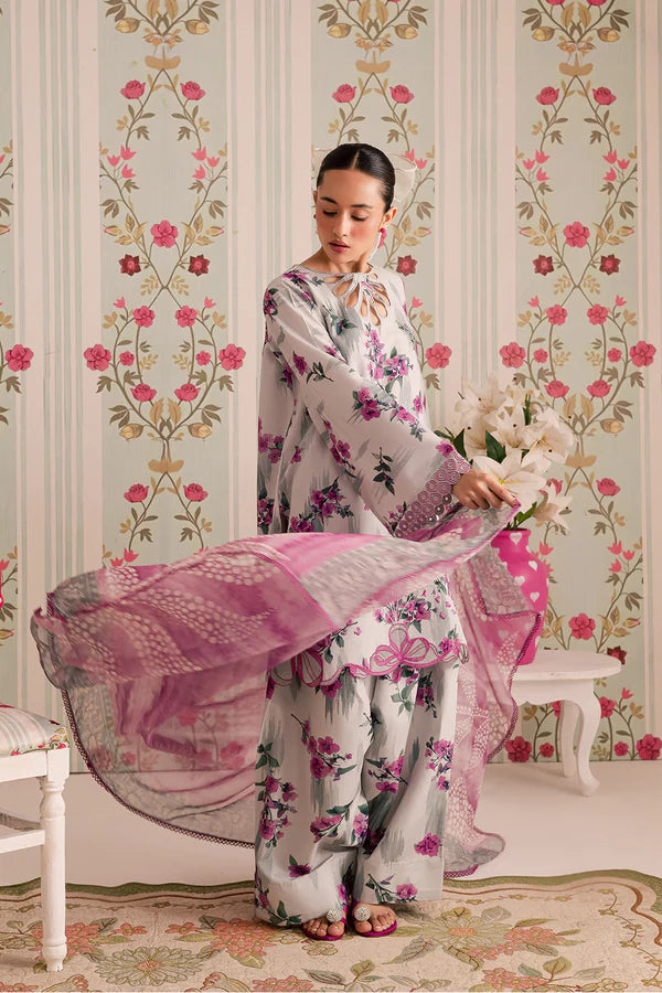 Embroidered lawn silk shirt, printed chiffon dupatta, printed lawn silk farshi shalwar